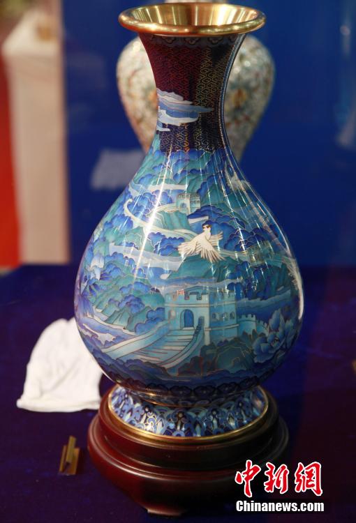 | Diese Cloisonné-Vase wurde von acht chinesischen Künstlern gemeinsam geschaffen. |
