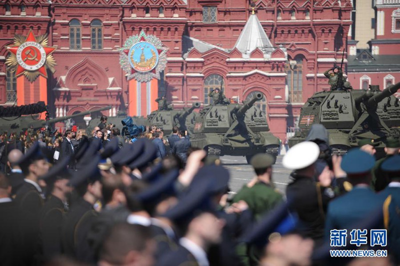Eine Formation von russischen Panzernrollt über den Roten Platz.