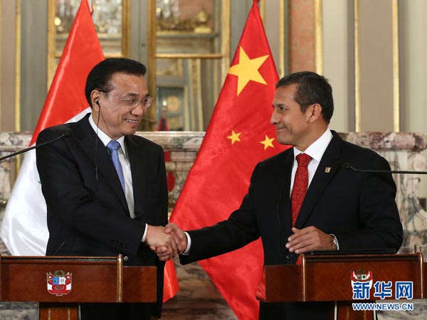 Chinas Premier Li Keqiang ist am Freitag mit dem peruanischen Pr?sidenten Ollanta Humala zusammengekommen. Dabei sagte Li, China und Peru sollten auf Basis ihres Freihandelsabkommens die industrielle Zusammenarbeit ausbauen. Chinesische Unternehmen würden aktiv an dem transkontinentalen Eisenbahnprojekt teilnehmen, das Perus Küste am Pazifik mit Brasiliens Atlantik-Küste verbinden soll, betonte Ministerpr?sident Li. Humala würdigte Chinas Teilnahme am Bau der transkontinentalen Eisenbahn. Von diesem Projekt k?nnten Peru, Brasilien und China profitieren und Chinas Beteiligung daran sei unabh?ngig, sagte Humala.