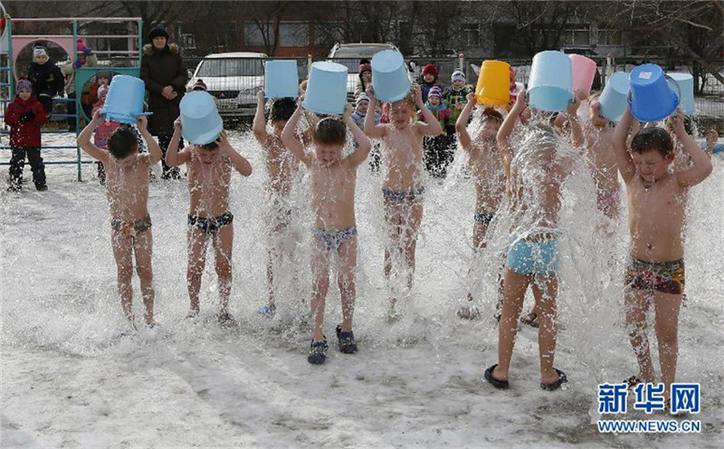 | Russland, 11. M?rz 2015: Trotz eisiger K?lte übergie?en sich die Kinder in einem Kindergarten in Sibirien mit Eiswasser. |