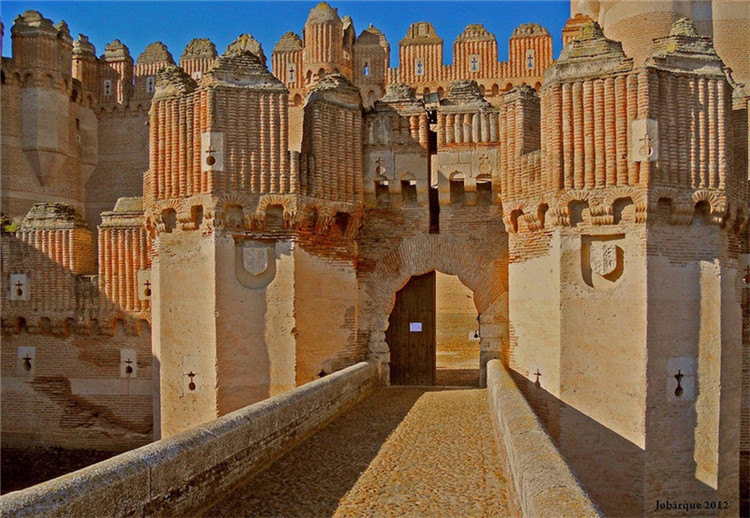 | Das Kastell von Coca ist das Wahrzeichen der gleichnamigen Stadt in Spanien. Der Wohnbau ist von zwei massiven Mauerringen aus Backstein umgeben, die mit Zinnen bewehrt und zahlreichen Rundtürmen versehen sind. Das Kastell ist das malerischste Beispiel für den Mudéjar-Stil. Heute ist darin eine Landwirtschaftsschule untergebracht. |