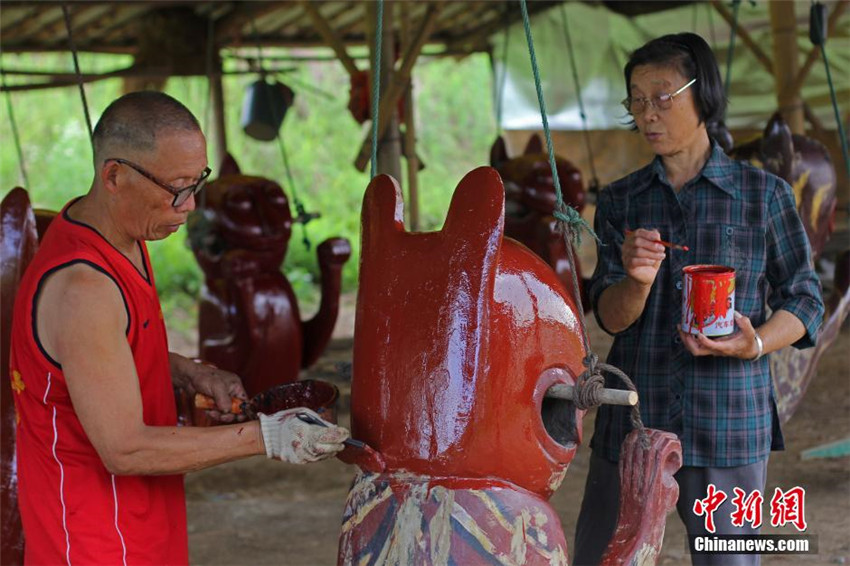 | Zhou Chengyun und seine Frau beim Bemalen der Drachenk?pfe. |