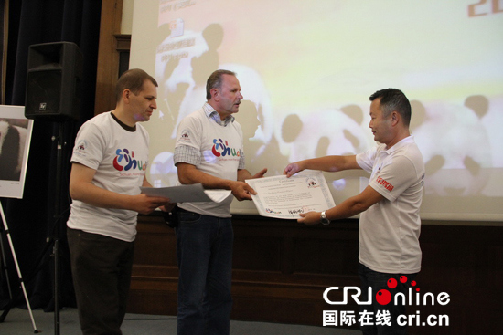 | Zwei belgischen Pandafans werden bei der Pressekonferenz Zeugnisse über die Mitgliedschaft in der Reisegruppe verliehen. |