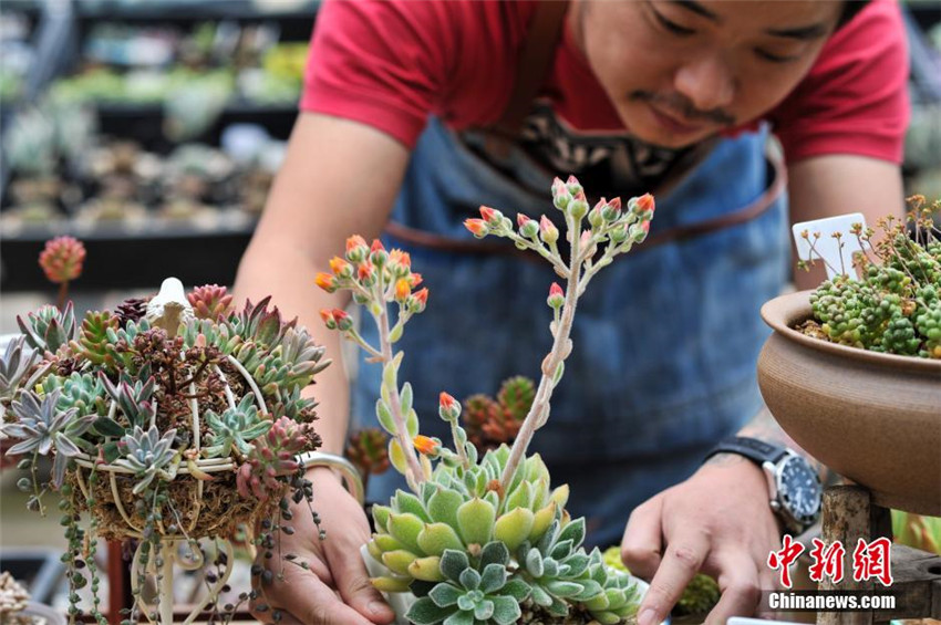 | Liu Jie kam im Jahr 2010 zum ersten Mal mit Sukkulenten in Berührung. Heute betreibt er ein Café in Kunming, der Hauptstadt der Provinz Yunnan, in dem die Kunden diese auch kaufen k?nnen. Er hat sogar in einem Vorort von Kunming ein spezielles Gew?chshaus für seine Sukkulenten-Zucht gebaut. |