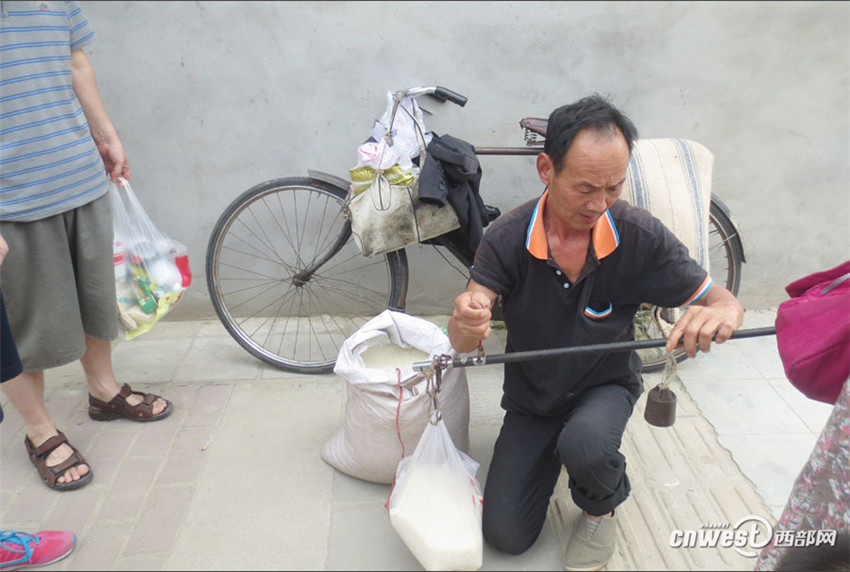 | Der Verk?ufer w?gt das Reis für seine Kunden. |