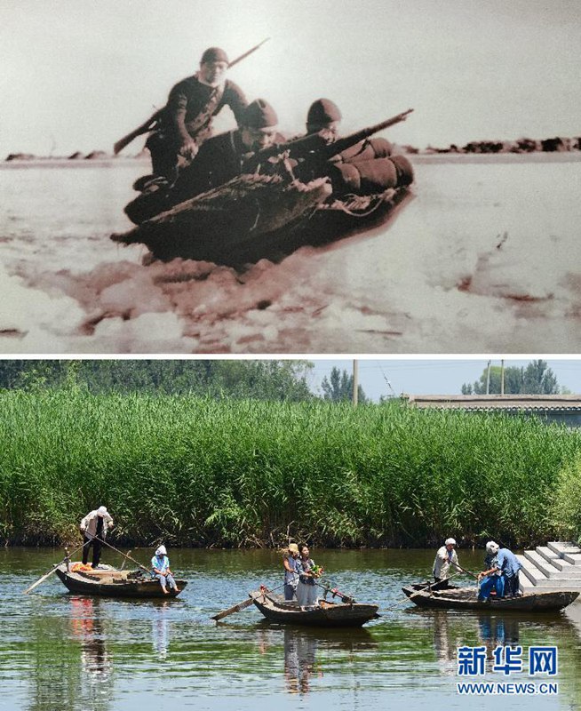 | Oben: Chinesische Milizion?re trainieren 1945 auf dem vereisten Baiyangdian See in der Provinz Hebei. Unten: Heute stellen Schauspieler dort eine Szene aus der Zeit der japanischen Besatzung nach. |