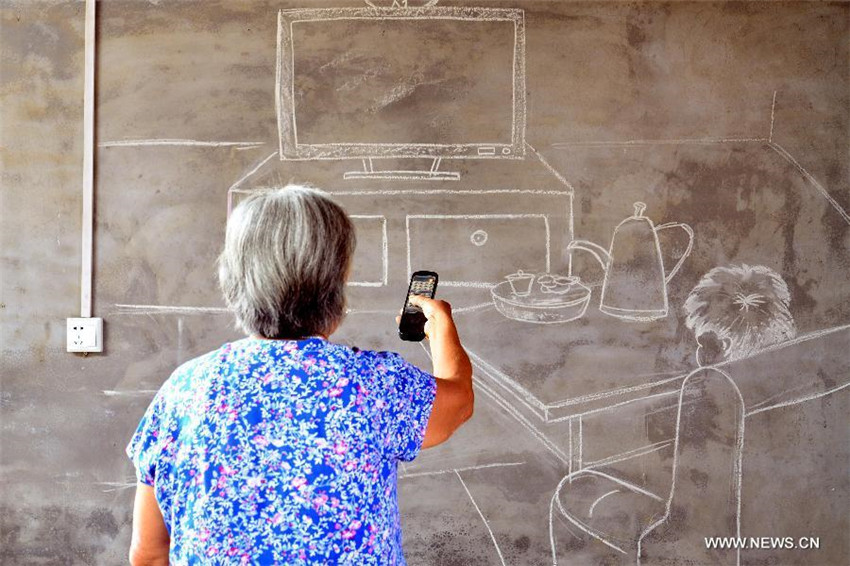 | Oma Liu sitzt alleine zu Hause vor dem Fernseher. |