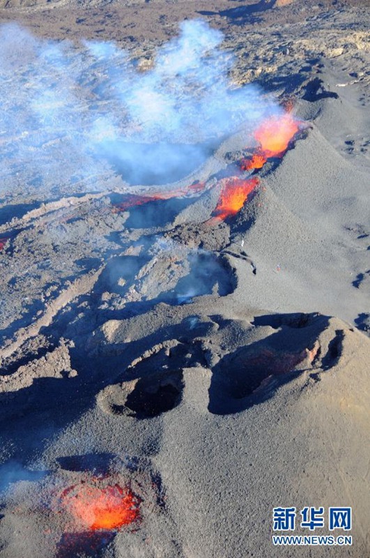 | Die Eruption des Piton de la Fournaise aus der Vogelperspektive. |