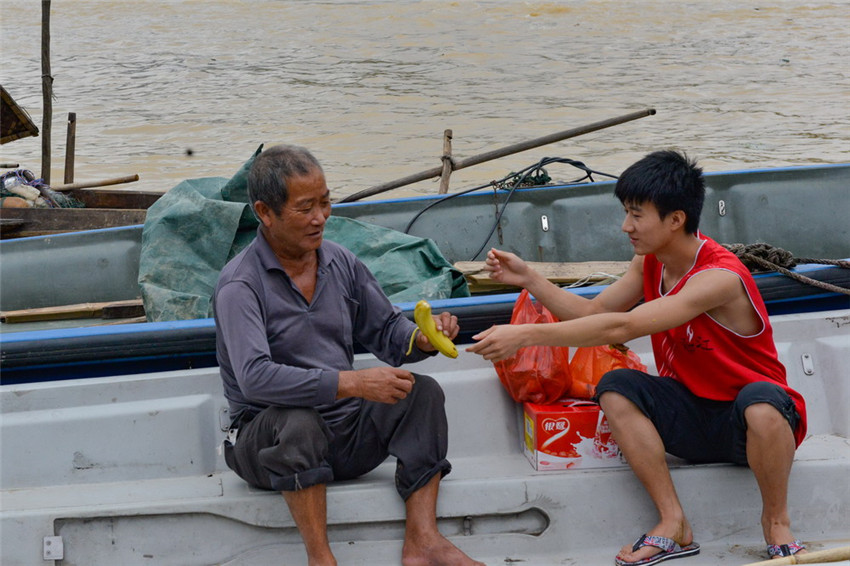 | Zheng Qiankun (rechts) besucht F?hrmann Liang mit Obst. Vor acht Jahren hat Liang ihn aus dem Wasser gerettet. |