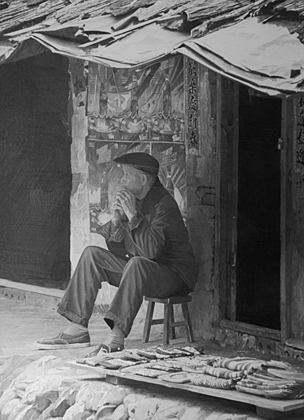 | Ein alter Mann sitzt vor einem Laden in Yangshuo, einem bekannten Tourismusziel im Autonomen Gebiet Guangxi der Zhuang. |