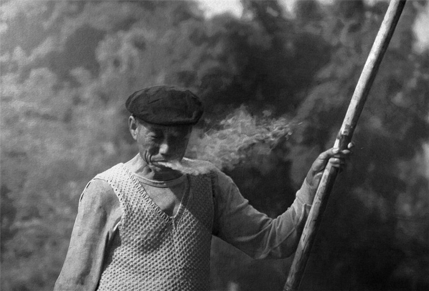 | Rauchend und mit einem Stock steuert der F?hrmann sein Bambusflo? über den Li-Fluss. |