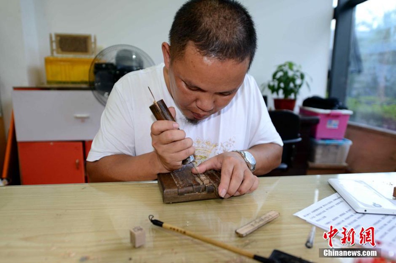 | Volkskünstler Qiu Zhiqiang schnitzt Schriftzeichen. |