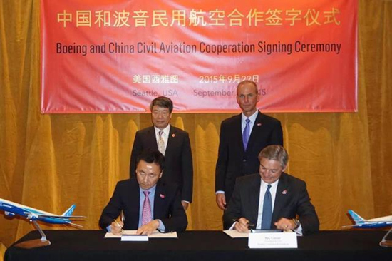 Kooperation im Luftfahrtsektor: Vertreter von diversen chinesischen Firmen unterzeichnen mit dem amerikanischen Flugzeugbauer Boeing einen Vertrag über die Lieferung von 300 Flugzeugen.