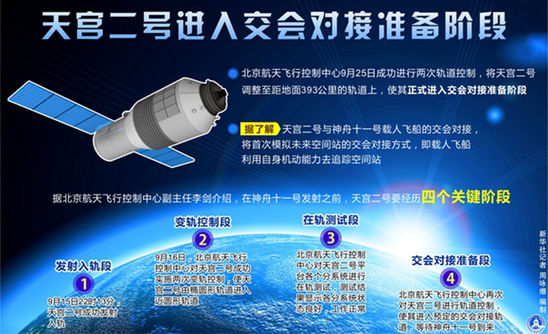 Die Verbindung zwischen Tiangong 2 und Shenzhou 11 soll eine v?llig neue Verbindungsmethode für zukünftige Raumstationen simulieren, mit welcher Raumschiffe durch eigene Man?vrierf?higkeit an eine Raumstation andocken.