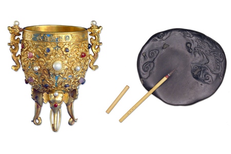 Eine Schale aus massivem Gold aus der Qing-Dynastie (L), ein Kalligraphiepinsel, der von alten Kaisern der Qing-Dynastie verwendet wurde [Foto/Offizieller Weibo-Account des Palastmuseums]