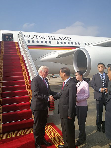 Im Dezember 2018 begrü?te Botschafter Shi Mingde (zweiter von links) den deutschen Pr?sidenten Frank-Walter Steinmeier bei dessen Staatsbesuch in China am Flughafen von Beijing. (Foto vom Interviewpartner zur Verfügung gestellt)