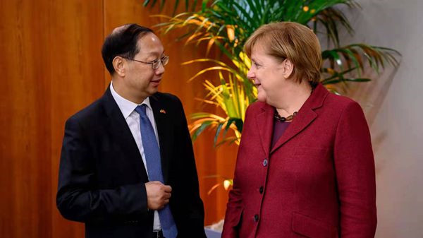 Im Februar 2019 verabschiedete sich Botschafter Shi Mingde vor seiner Rückkehr nach China von Bundeskanzlerin Angela Merkel. (Foto vom Interviewpartner zur Verfügung gestellt)