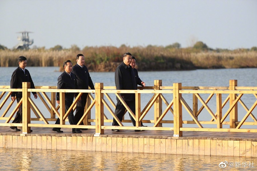 Am Nachmittag hat Xi den Anlegeplatz der Mündung des Gelben Flusses, das Zentrum für ?kologische Beobachtung des Deltas des Gelben Flusses und das Naturschutzgebiet auf Staatsebene vom Delta des Gelben Flusses besucht und sich vor Ort über die hydrologische Situation des Flusslaufs, die ?ko-Umwelt des Feuchtbodens des Deltas des Gelben Flusses sowie den ?kologischen Schutz bzw. die hochqualitative Entwicklung des Einzugsgebiets des Gelben Flusses informiert.