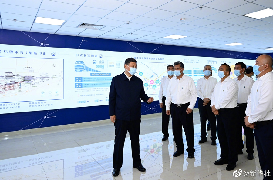 Nach dem Besuch der Universit?t begab sich Xi Jinping zur internationalen Trockenhafenzone von ürümqi. Sie war eines der ersten nationalen Logistikzentren des Typs Trockenhafen in China und ist ein Kennzeichenprojekt im Kerngebiet des Wirtschaftsgürtels entlang der Seidenstra?e. Xi sagte dort, Xinjiang sei im Zuge des gemeinsamen Aufbaus der Seidenstra?e nicht l?nger ein abgelegenes Gebiet, sondern ein Kerngebiet und ein Knotenpunkt.