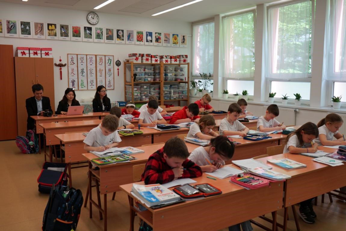 Im April 2024 diktieren Zweitkl?ssler chinesische Schriftzeichen w?hrend einer Chinesischstunde an der ungarisch-chinesischen zweisprachigen Schule. (Foto von Yi Lin)