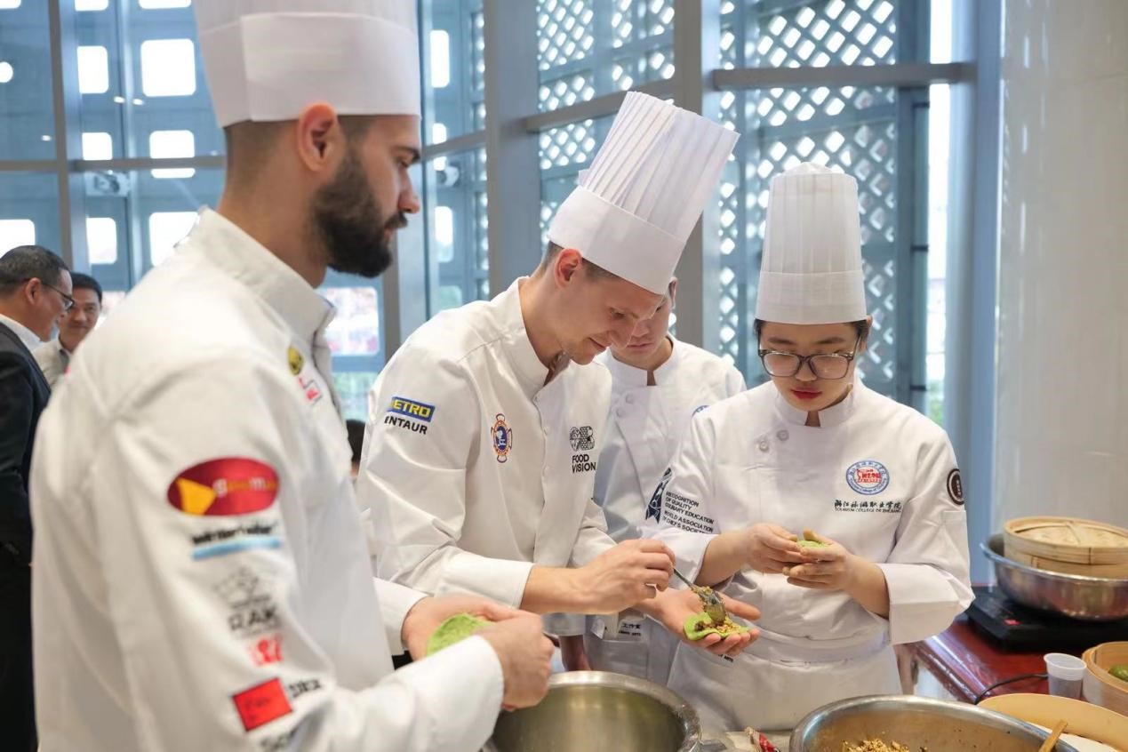 Am 11. April fand im Chinesischen Kulturzentrum in Belgrad das Bankett ?Der wunderbare Geschmack Chinas - Westseebankett“ statt, bei dem chinesische Lehrer und Schüler der Tourismusschule aus Zhejiang gemeinsam mit serbischen Lehrlingen aus der serbischen Werkstatt Luban Gerichte zubereiteten. Das Bild zeigt chinesische und serbische Lehrer und Schüler bei der Zubereitung von ?Qingtuan“, einem mit roter Bohnenpaste gefüllten Klebreiskn?del. (Foto wurde vom Chinesischen Kulturzentrum Belgrad zur Verfügung gestellt)