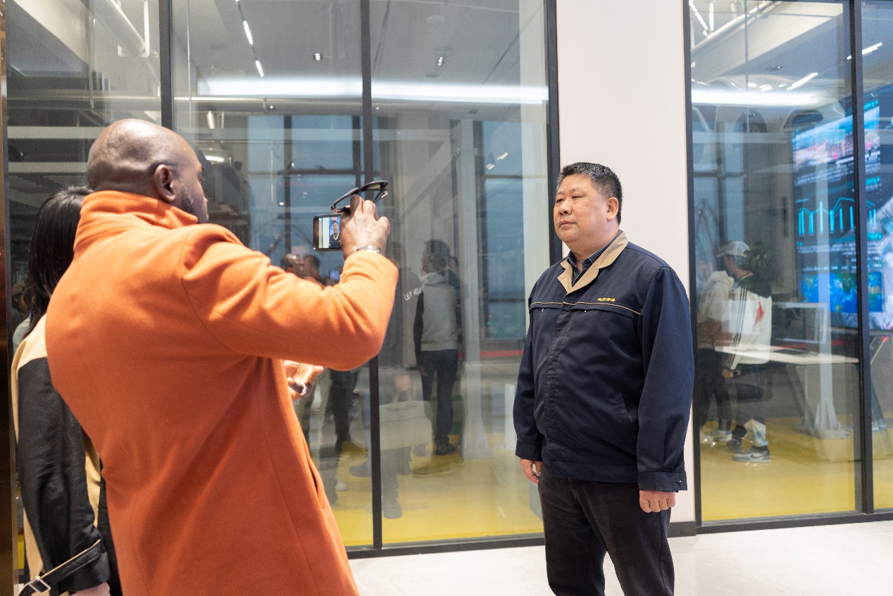 Ein ausl?ndischer Journalist beobachtet am 22. Oktober 2024 im Hafen von Lianyungang in der Stadt Lianyungang in der ostchinesischen Provinz Jiangsu eine Demonstration, wie Fahrzeuge in ein intelligentes vertikales Parkhaus ein- und ausfahren. (People’s Daily Online/Chang Sha)