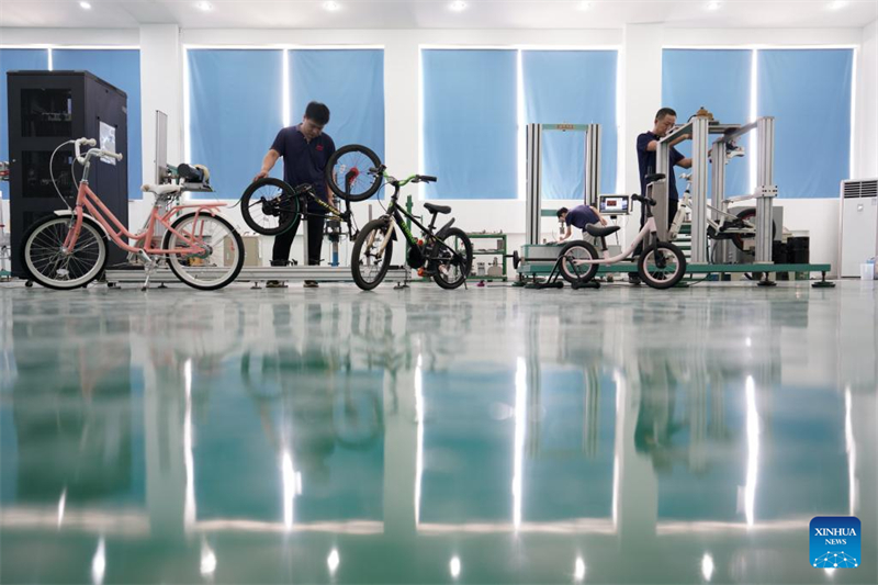 Arbeiter prüfen die Qualit?t neuer Kinderfahrr?der im Kreis Pingxiang in der nordchinesischen Provinz Hebei, 19. August 2024. (Xinhua/Mu Yu)