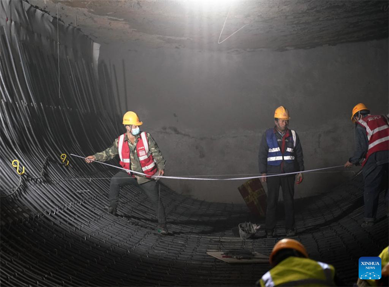 Arbeiter bei Bauarbeiten an der Station Hongmiao der U-Bahnlinie 22 in Beijing, 19. Februar 2025. (Xinhua/Zhang Chenlin)