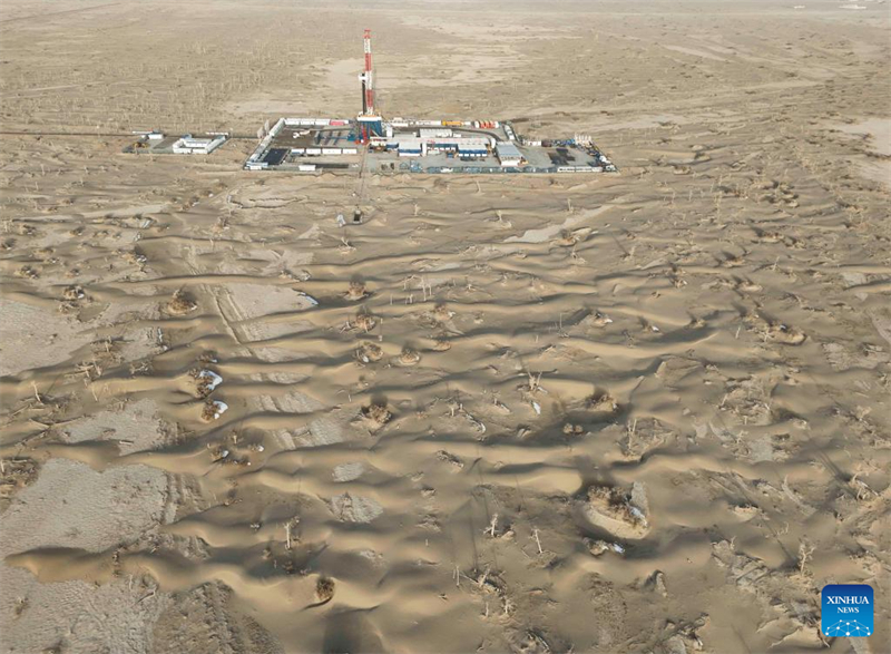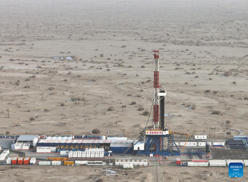 Das am 19. Februar 2025 aufgenommene Drohnenfoto zeigt einen Blick auf das ?Shenditake 1“, ein ultratiefes Bohrloch, im Hinterland der Taklimakan-Wüste im Tarim-Becken in der nordwestchinesischen Uigurischen Autonomen Region Xinjiang. (Xinhua/Hu Huhu)