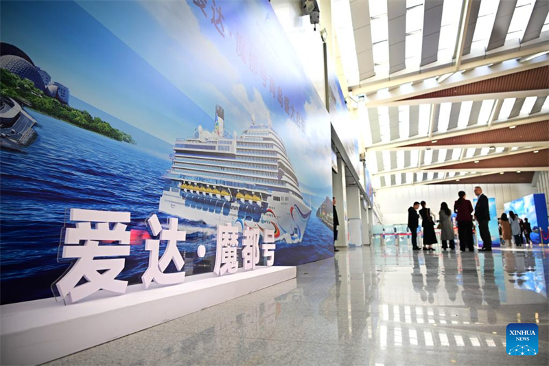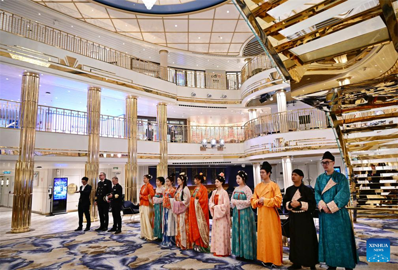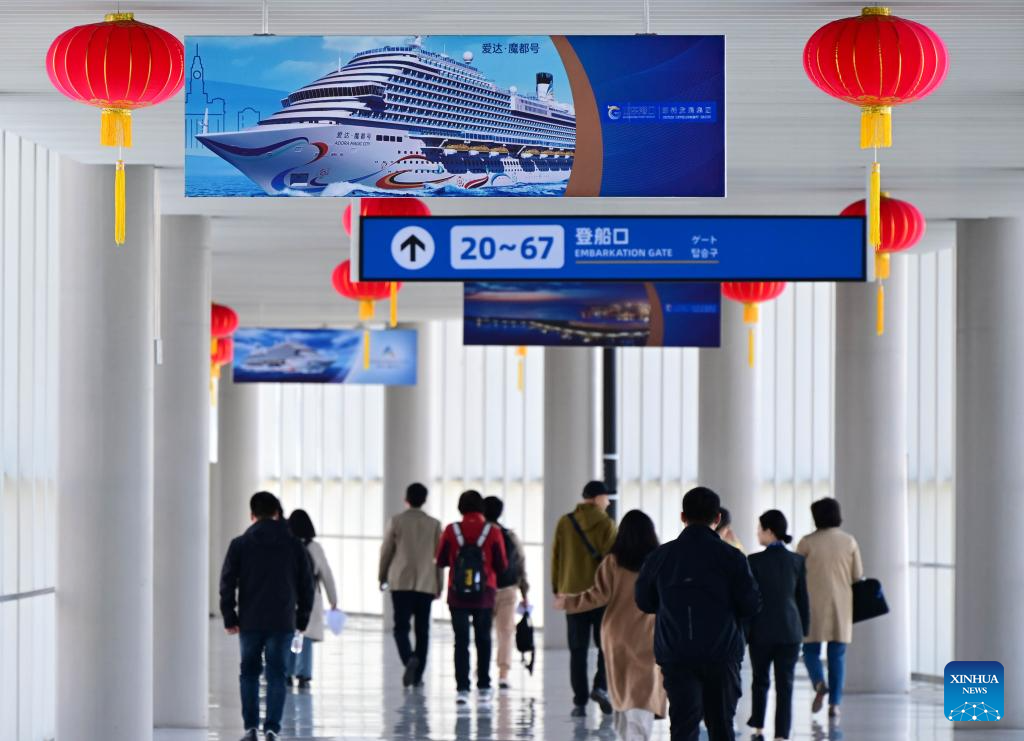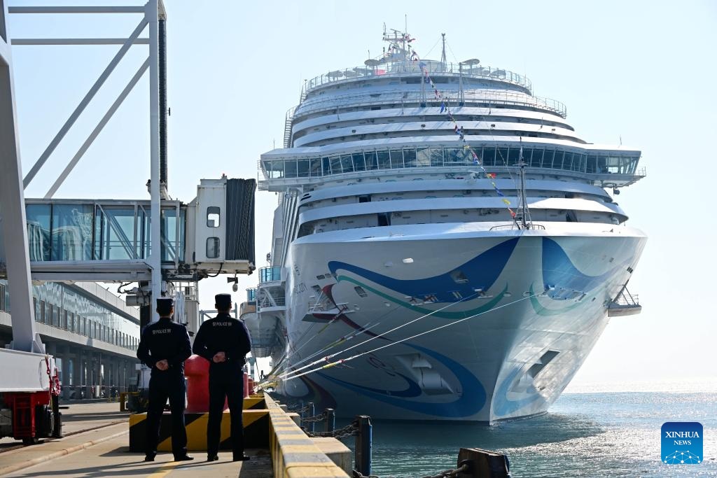 Besatzungsmitglieder der Adora Magic City begrü?en die Passagiere an Bord des Qingdao International Cruise Terminal in Qingdao, der ostchinesischen Provinz Shandong, am 6. April 2025. (Xinhua/Li Ziheng)