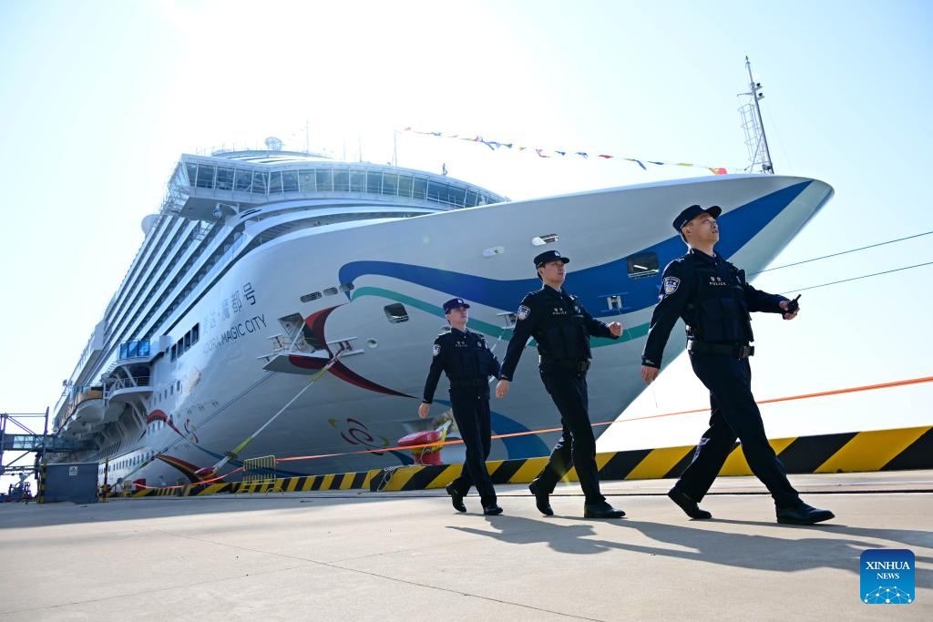Beamte der Einwanderungsbeh?rde gehen am 6. April 2025 am Qingdao International Cruise Terminal in Qingdao in der ostchinesischen Provinz Shandong an der Adora Magic City vorbei. (Xinhua/Li Ziheng)