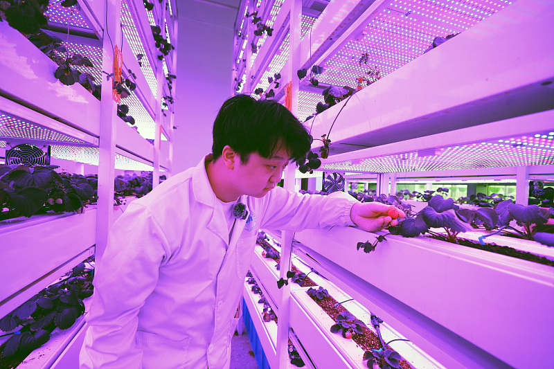 Ein Forscher arbeitet am 7. April 2025 in der unbemannten Pflanzenfabrik, die am Institut für urbane Landwirtschaft in Chengdu in der südwestchinesischen Provinz Sichuan gebaut wurde. (China News Service/An Yuan)