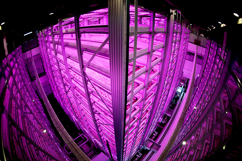 Eine Innenansicht der weltweit ersten 20-st?ckigen unbemannten vertikalen Gemüsefarm in Chengdu, südwestchinesische Provinz Sichuan, 7. April 2025. (China News Service/An Yuan)