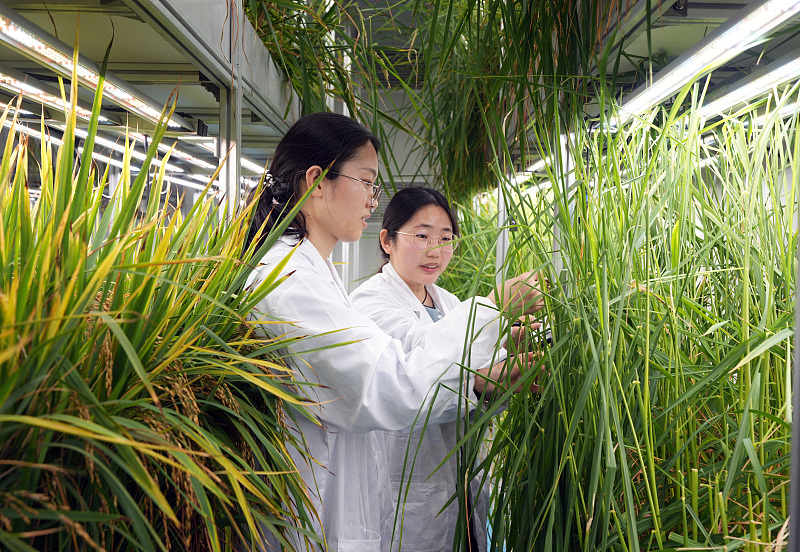 Zwei Forscherinnen arbeiten in der unbemannten Pflanzenfabrik, die am Institut für urbane Landwirtschaft in Chengdu in der südwestchinesischen Provinz Sichuan gebaut wurde, 7. April 2025. (China News Service/An Yuan)