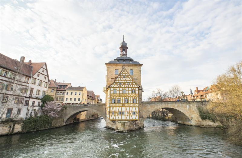 Dieses Foto vom 23. M?rz 2025 zeigt das ikonische Geb?ude der alten Stadt Bamberg, das ehemalige Rathaus an der Regnitz, im Bundesland Bayern. (Xinhua/Zhang Fan)