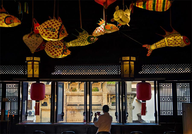 Ein Tourist ruht sich in einem Café in der alten Stadt Huizhou im Kreis Shexian in der ostchinesischen Provinz Anhui aus, 18. M?rz 2025. (Xinhua/Guo Chen)