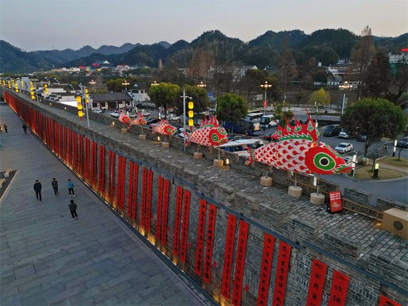 Dieses Foto vom 19. M?rz 2025 zeigt fischf?rmige Laternen an den alten Mauern der alten Stadt Huizhou im Kreis Shexian in der ostchinesischen Provinz Anhui. (Xinhua/Guo Chen)
