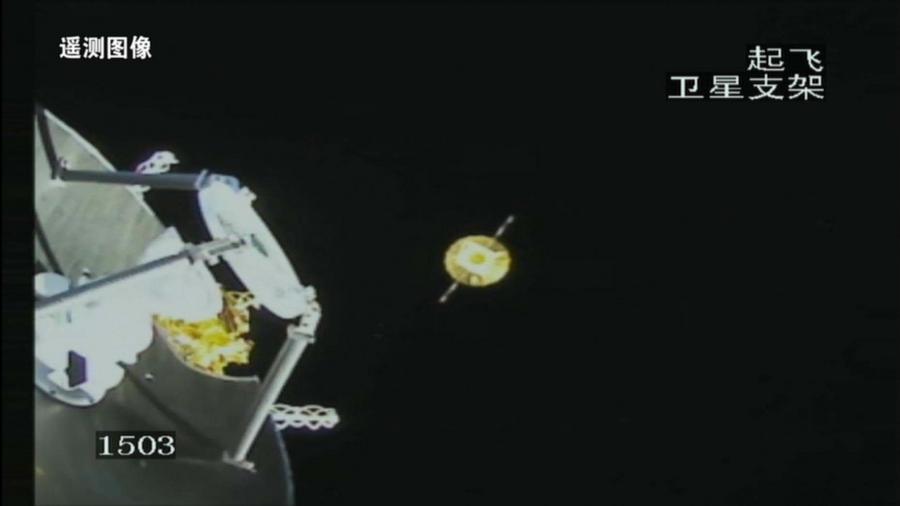 Dieses Foto, das am 20. M?rz 2024 mit einer Kamera der Tr?gerrakete Langer Marsch 8 aufgenommen wurde, zeigt die erfolgreiche Trennung des übertragungssatelliten Queqiao-2 (Mitte) mit ausgeklappten Solarflügeln und ausgefahrener Antenne von der Tr?gerrakete. (Foto: Chinesische Raumfahrtbeh?rde/Ver?ffentlichung durch Xinhua)