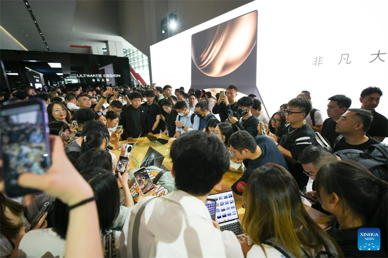 Kunden testen die mit HarmonyOS betriebenen Laptops von Huawei nach der Vorstellung des Huawei MateBook Pro und des MateBook Fold Ultimate Design in Chengdu, in der südwestchinesischen Provinz Sichuan, 19. Mai 2025. (Xinhua/Xu Bingjie)