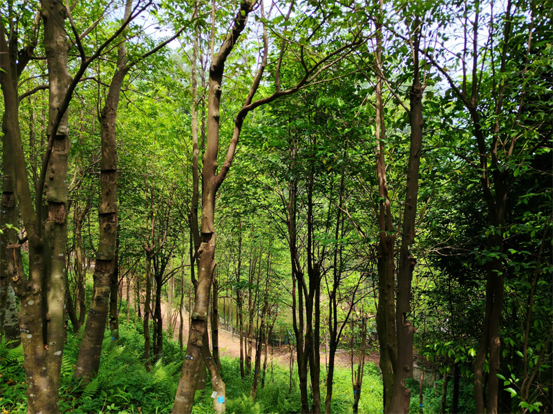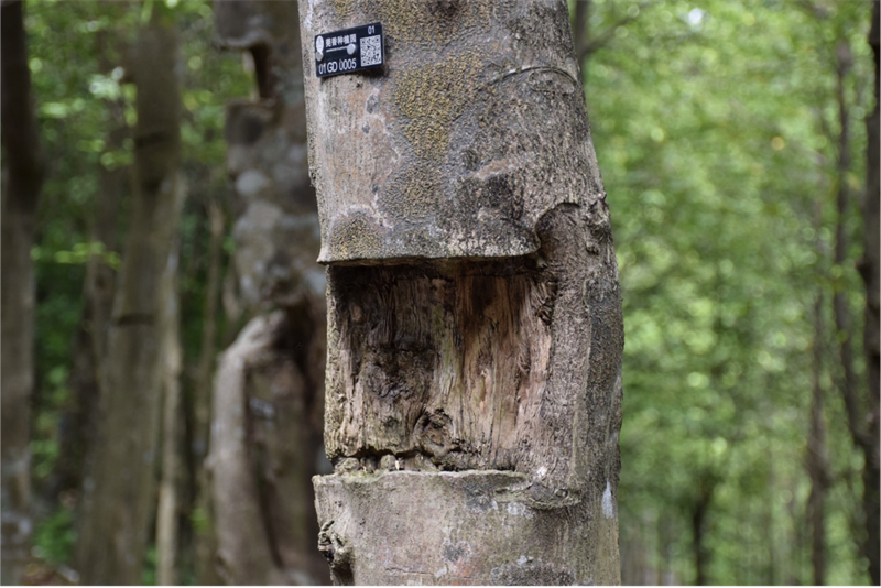Im Agarholz-Schutzpark von Dalingshan in Dongguan, Guangdong, tragen die St?mme der Adlerholzb?ume zahlreiche ?Dufttore“ – Markierungen, die den Entstehungsprozess des kostbaren Agarharzes dokumentieren. Das Harz entsteht, wenn verletzte B?ume als Abwehrreaktion Duftstoffe absondern. Das subtropische Monsunklima, der schwach saure Boden sowie die einzigartige mikrobielle Umgebung der Hügellandschaft Dongguans begünstigen die natürliche Harzbildung.