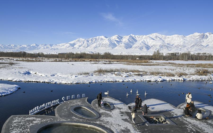 Touristen besuchen am 22. Dezember 2024 hei?e Quellen im Bortala River National Wetland Park in der Mongolischen Autonomen Pr?fektur Bortala in der Uigurischen Autonomen Region Xinjiang im Nordwesten Chinas. (Xinhua/Chen Shuo)