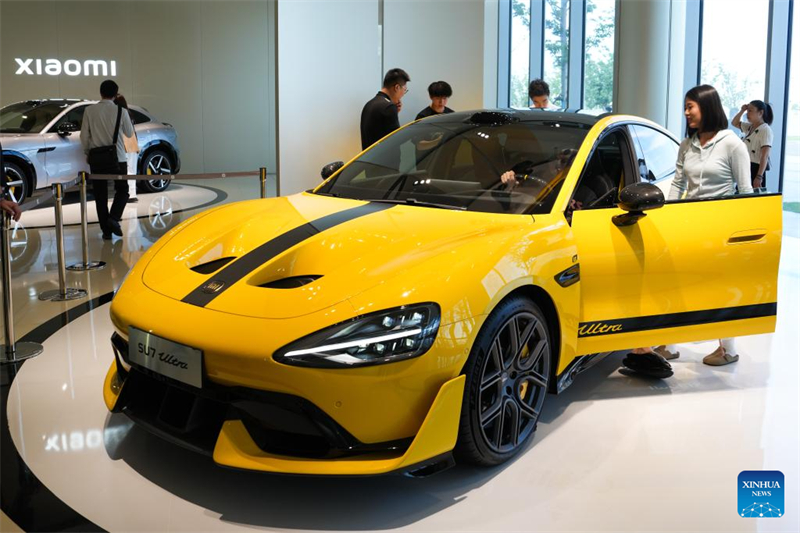 Besucher beim Erkunden eines Elektrofahrzeugs am 16. Juni 2025 in der Automobilfabrik von Xiaomi in Beijing. Die Automobilfabrik des chinesischen Technologieriesen Xiaomi befindet sich in der Beijing Economic-Technological Development Area und erstreckt sich über eine Fl?che von mehr als 700.000 Quadratmetern. Das Werk vereint Forschung, Tests, Produktion und Vertrieb und ist für die ?ffentlichkeit zug?nglich, um seine hochmoderne Automobilproduktion zu pr?sentieren. (Foto: Xinhua/Zheng Huansong)