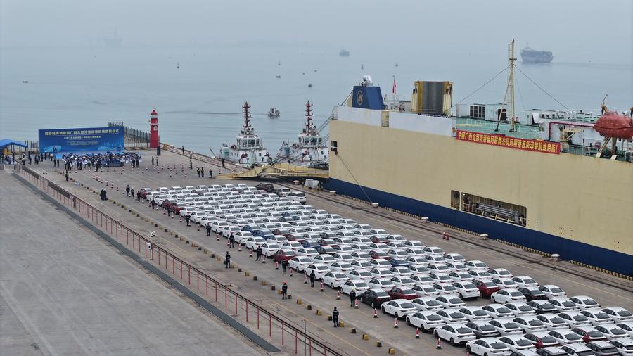 Im Hafen Qinzhou im südchinesischen Autonomen Gebiet Guangxi der Zhuang-Nationalit?t wird am 7. April 2025 die Zeremonie zur Er?ffnung der ersten ?RoRo“-Route zwischen dem chinesischen Beibu-Golfhafen und Jebel Ali in Dubai zelebriert. (Xinhua)