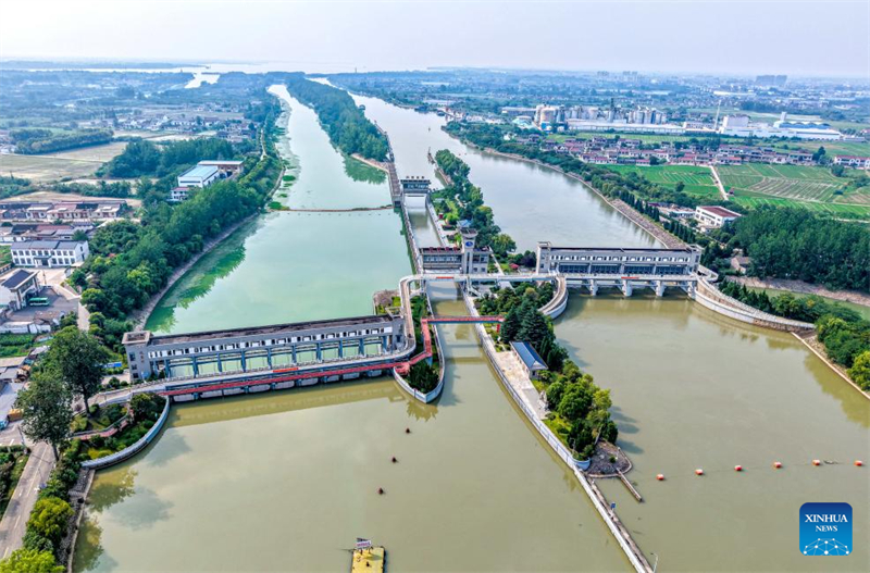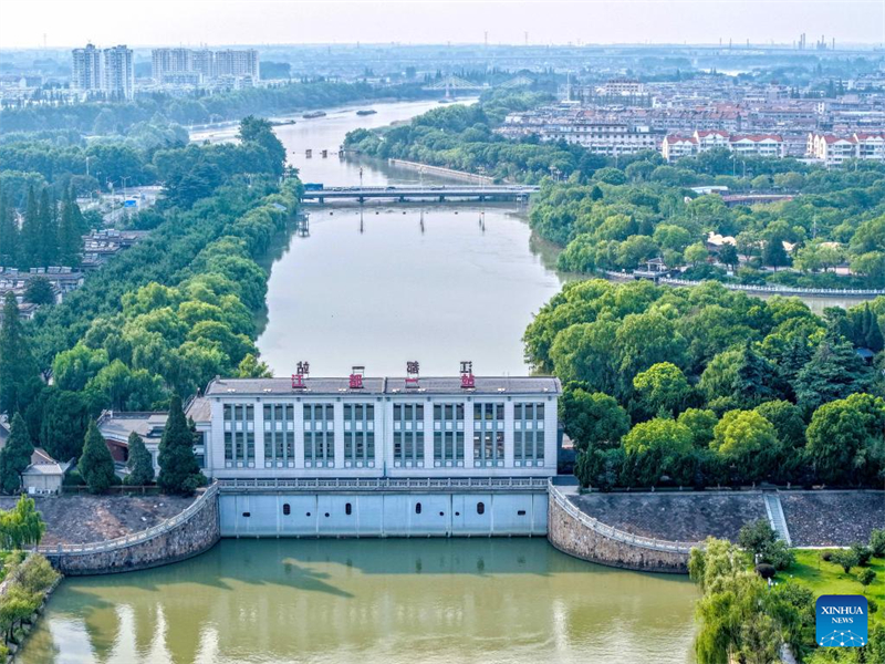 Ein Drohnenfoto vom 6. Juli 2025 zeigt das Jiangdu-Wasserkontrollprojekt am Anfang der ?stlichen Route des Süd-Nord-Wasserumleitungsprojekts in Yangzhou in der ostchinesischen Provinz Jiangsu. (Ren Fei/Xinhua)