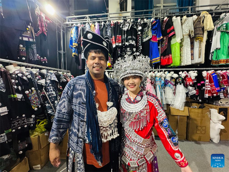 Der deutsche Nachhaltigkeitsforscher Alexander Kuch probiert Miao-Batik und silberne Accessoires an, w?hrend er an der ?Village T“-Modenschau in Kaili in der südwestchinesischen Provinz Guizhou teilnimmt, 5. Juli 2025. (Xinhua)