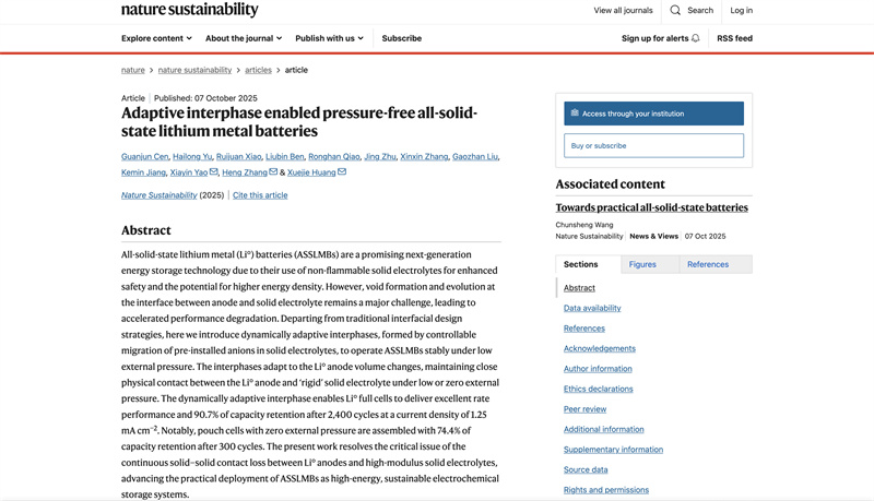 Chinesische Wissenschaftler haben eine selbstadaptive Zwischenphase in Festk?rper-Lithiumbatterien entwickelt, die ohne ?u?eren Druck einen engen Kontakt zwischen der Lithium-Metall-Anode und dem Festelektrolyten aufrechterh?lt. Dies ist ein Durchbruch, der einen wichtigen Engpass auf dem Weg zur Kommerzialisierung entscheidend überwindet.