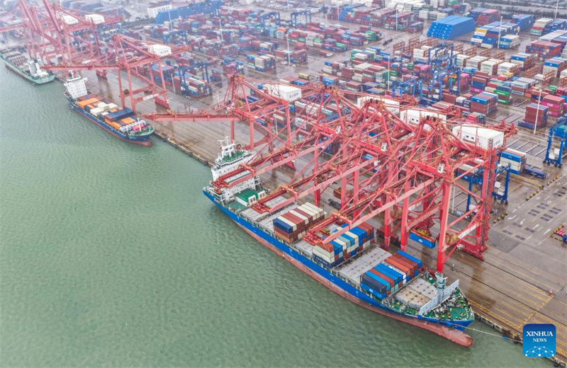 Eine am 13. Oktober 2025 aufgenommene Drohnenaufnahme zeigt eine Szene am Containerterminal des Hafens von Lianyungang in der ostchinesischen Provinz Jiangsu. Chinas gesamte Warenimporte und -exporte stiegen in den ersten neun Monaten des Jahres 2025 auf 33,61 Billionen Yuan, was einem Anstieg von vier Prozent gegenüber dem Vorjahr entspricht, wie offizielle Daten am Montag zeigten. (Wang Jianmin/Xinhua)