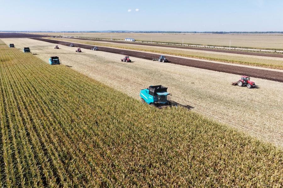 Landwirtschaftliche Maschinen bei der Maisernte auf einem Feld einer Zweigniederlassung der Heilongjiang Agriculture Company Limited in der nordostchinesischen Provinz Heilongjiang am 23. September 2025. (Xinhua/Wang Song)
